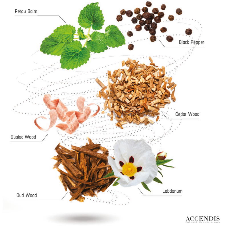 - Notes de cœur : Cèdre, Gaïac, Oud