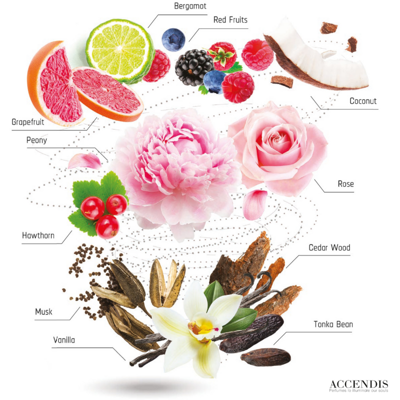 - Notes de cœur : pivoine, rose, aubépine